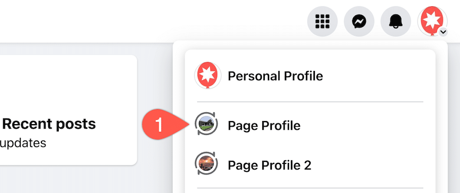 - Alterar perfil: Clique na sua imagem de perfil no canto superior direito e mude para o perfil da Página.