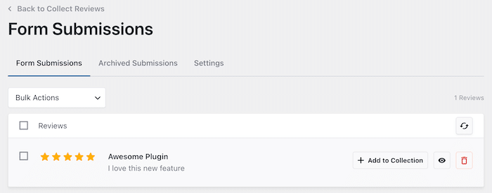 1. Quando os clientes enviam comentários através do formulário ligado, estes aparecem no separador Envios de formulários, na sua coleção.