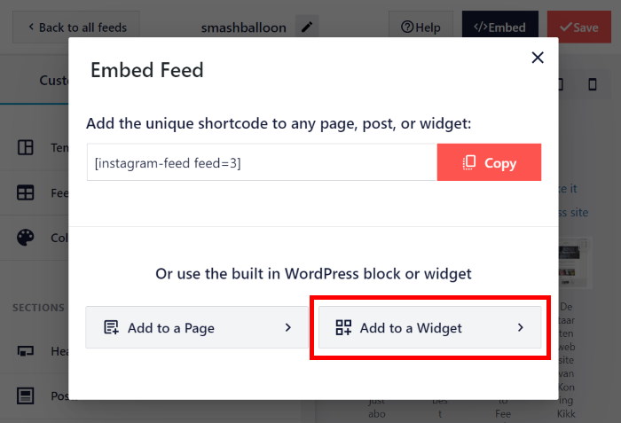 Com a ajuda do editor de feeds em direto, pode começar a incorporar feeds do Instagram na barra lateral ou no rodapé como um widget.