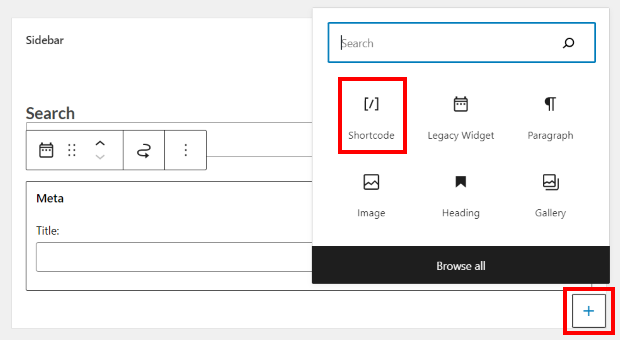 Depois de escolher a barra lateral, clique no ícone de mais (+) e, em seguida, selecione o widget Shortcode nas opções.
